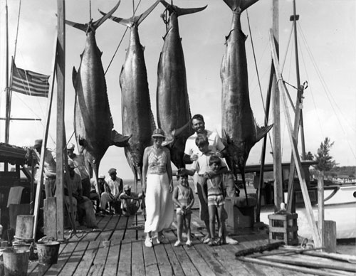 Ernest Hemingway con su familia: Pauline, Gregory, John y Patrick Hemingway posan junto a cuatro peces espada en el puerto de Bimini, el 20 de julio de 1935.
