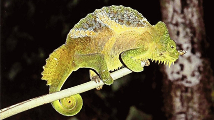 Clase: Reptilia Orden: Squamata Familia: ChamaeleonidaeGénero: Trioceros Distribución: Restringida a bosques de niebla de altura (entre los 1.000 y los 2.200 m de elevación) en las montañas de Camerún y unas poblaciones pequeñas en Nigeria. Estatus: Se considera especie vulnerable, con posibilidades a pronto reclasificarse como especie amenazada, debido a la fragmentación de su hábitat por la deforestación. La especie se incluye en el segundo apéndice de la cites. Alimentación: Son principalmente insectívoros y muestran una preferencia marcada por las mariposas y otros insectos voladores, aunque también cazan grillos, orugas, escarabajos, etc. Aspecto: Los machos presentan cuatro cuernos en la punta de su nariz y una cresta tipo vela en la parte anterior de la cola; además, ambos géneros cuentan con un pequeño casco en la cabeza, una vela dorsal y escamas gulares prominentes. Su coloración basal es verde brillante con matices azules, blancos, sienas, naranjas, amarillos, rosáceos y cerúleos. Tamaño: Machos 30-35 cm / hembras 25-29 cm. Son ligeros para sus proporciones. Esperanza de vida: No hay datos en vida libre, en cautiverio suelen vivir entre 5 y 7 años. Las hembras un poco menos, entre 3 y 5, dependiendo de sus ciclos reproductivo