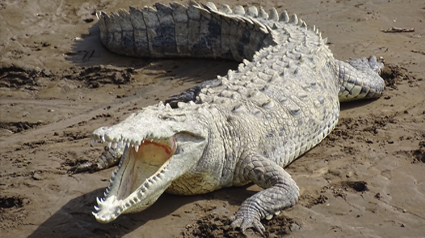Clase: Reptilia Orden: Crocodilia Familia: CrocodylidaeGénero:Crocodylus Distribución: Es la especie de cocodrilo americano más ampliamente distribuida. Su rango abarca desde Florida y las Antillas hasta Perú, incluyendo toda la vertiente del Pacífico y sudeste mexicano, Centroamérica, Colombia, Venezuela y Ecuador. Usualmente se los encuentra en ambientes costeros y salobres, tales como manglares, esteros, atolones e islas. Estatus: Se considera especie vulnerable, con posibilidades a pronto reclasificarse como especie amenazada, debido a la fragmentación de su hábitat por la deforestación. La esp ecie se incluye en el segundo apéndice de la cites. Alimentación: Son los depredadores cumbre de los ecosistemas en los que habitan, son carnívoros generalistas con una dieta sumamente variada que incluye peces, crustáceos, mamíferos, reptiles, aves e incluso tiburones, a los que cazan cuando penetran en el mar. Aspecto: Son corpulentos, con cola poderosa y cabeza alargada. Suelen tener una coloración verde olivo con vetas amarillas y café, con el abdomen blanco y el dorso pardo. Tamaño: Es la segunda especie más grande a nivel mundial, solo superada por los cocodrilos de agua salada australianos. Se han registrado ejemplares de más de 5 m y 900 kg, aunque su tamaño promedio ronda los 3-4 m y 350 kg para los machos, y los 2,5-3 m y 150 kg para las hembras. Esperanza de vida: El récord en cautiverio es de 80 años, pero lo usual es de 40 a 60.