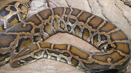 Clase: Reptilia Orden: Squamata Familia: Pythonidae Género: Python Distribución: Muy amplia, abarca buena parte del sudeste asiático y las islas de Indonesia. Estatus: Debido a roces con asentamientos humanos y a la caza furtiva, en estado silvestre se considera vulnerable. En Florida figura como una especie invasora nociva. Alimentación: Son depredadoras vigorosas y poco selectivas, cazan principalmente aves y mamíferos a los cuales matan por constricción. Aspecto: Serpientes de cuerpo macizo y ancho. La coloración nominal se presenta en un atractivo patrón tipo camuflaje militar, con bloques café sobre fondo verde pálido. En el mercado de mascotas también prevalecen variedades albinas, leucísticas, amelanísticas, etc. Tamaño: Es una de las cinco serpientes más grandes del mundo. Las hembras suelen ser más voluminosas que los machos, en libertad llegan a medir poco más de 5 m y a pesar 60 kg. Sin embargo, en cautiverio se han registrado ejemplares de más de 6,5 m y 80 kg. Esperanza de vida: Si bien en cautiverio llegan a ser bastante longevas, en el medio silvestre es infrecuente que pasen de los 20 o 25 años.