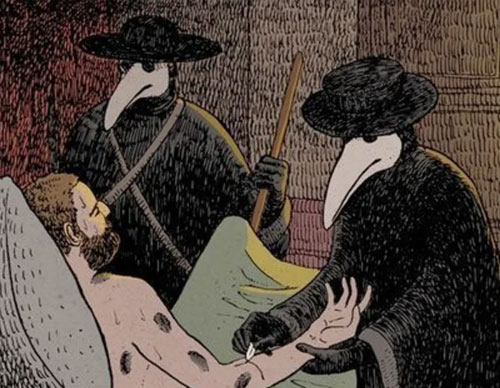 La terrible experiencia de la pandemia del Covid-19 nos hace comprender la trágica situación en Orán, donde se centra la novela. No son disfraces, son las EPI con la que se protegían los médicos en aquella época.